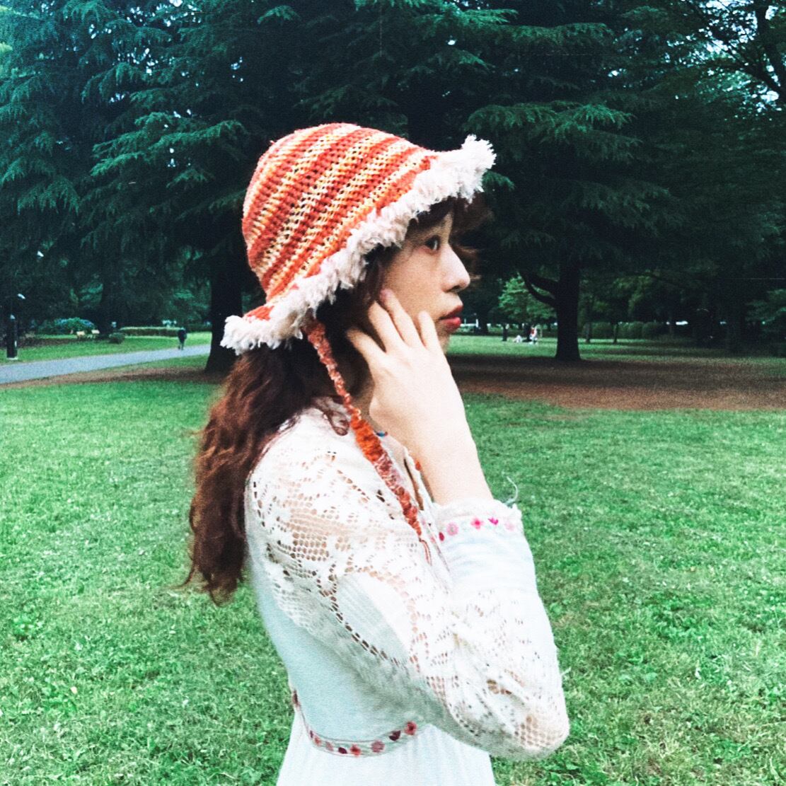 ヒッピースタイルにぴったりで70年代を髣髴とさせる帽子です。暖色系のさまざまな種類の毛糸を使用しており、存在感がありつつも多種多様なコーディネートに合うようなデザインになっています。