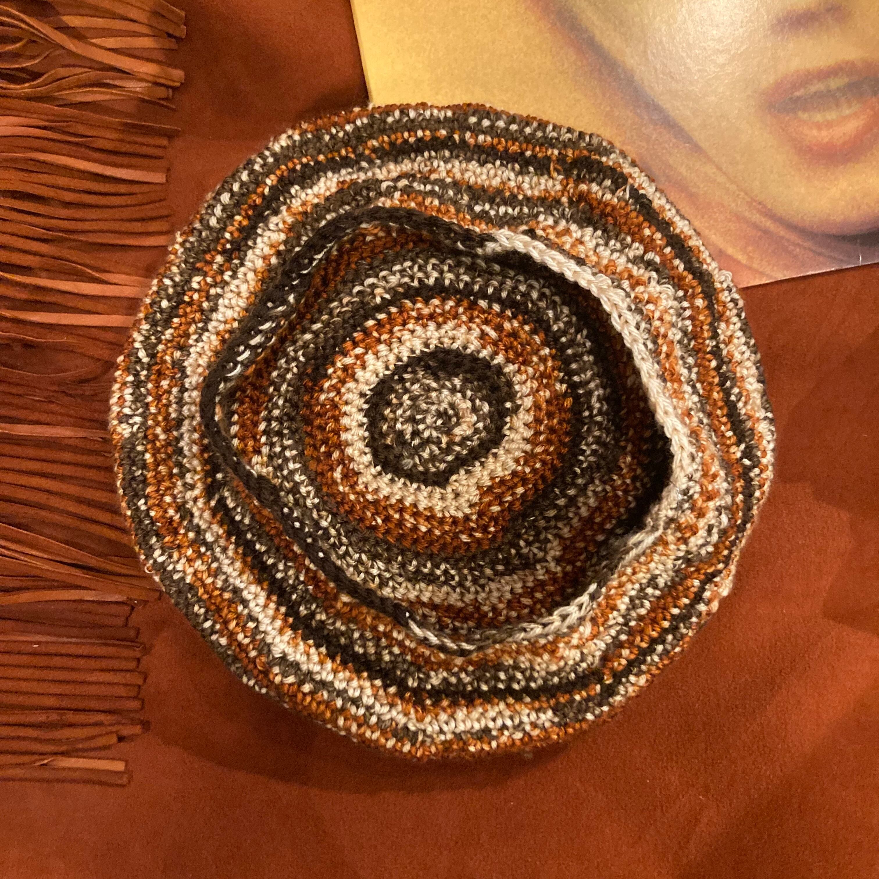 ブラウンのグラデーションの糸を使用したベレー帽は幅広いお洋服に合わせていただけますが、特にスウェードのジャケットやスカートに合わせて70年代ライクに着るのがおすすめです。