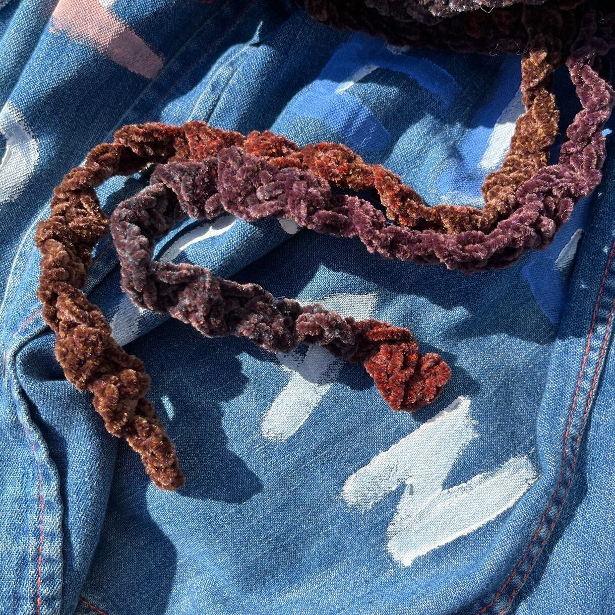 ベロアの毛糸を使用した秋冬らしさ満載の帽子。深めにかぶれてつばも下にまっすぐ落ちるように編みました。ベロア素材のお洋服や、ゴブランジャケットなどに合わせて被るのがおすすめです。