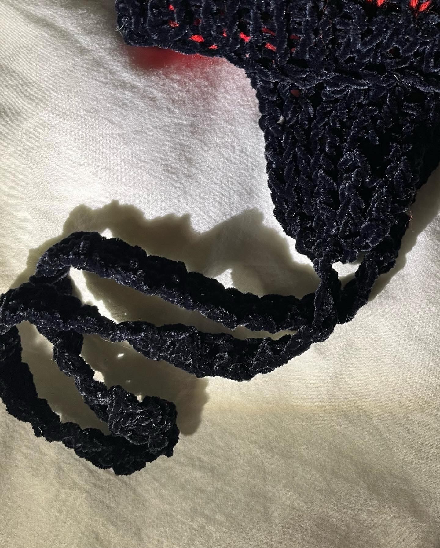 耳当て付きで暖かく、紐部分はベロアのリボンみたいに見えるように少し太く編んでいます。