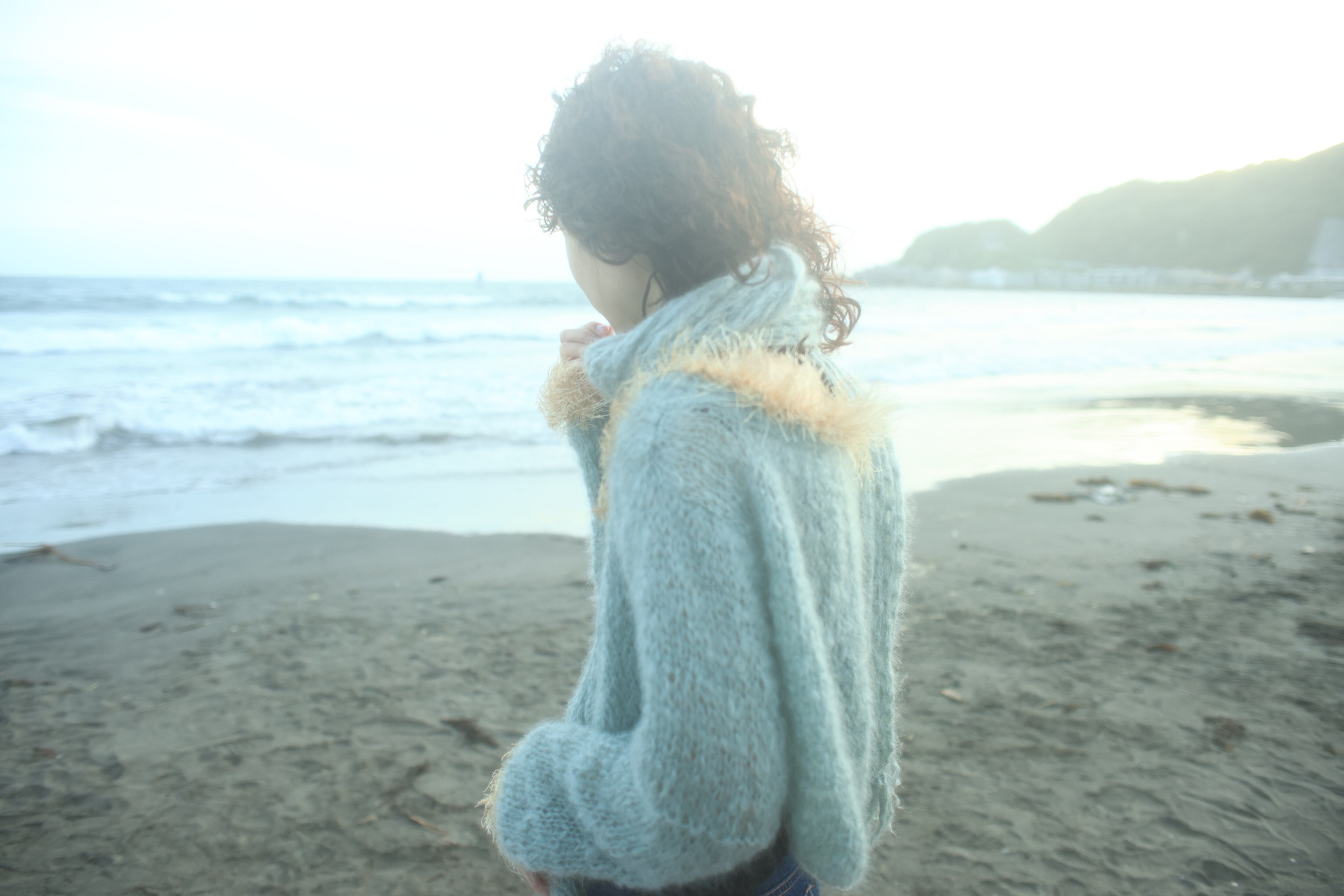 身幅は広め、着丈は短めで、スタイルアップして見えるようなセーターです。